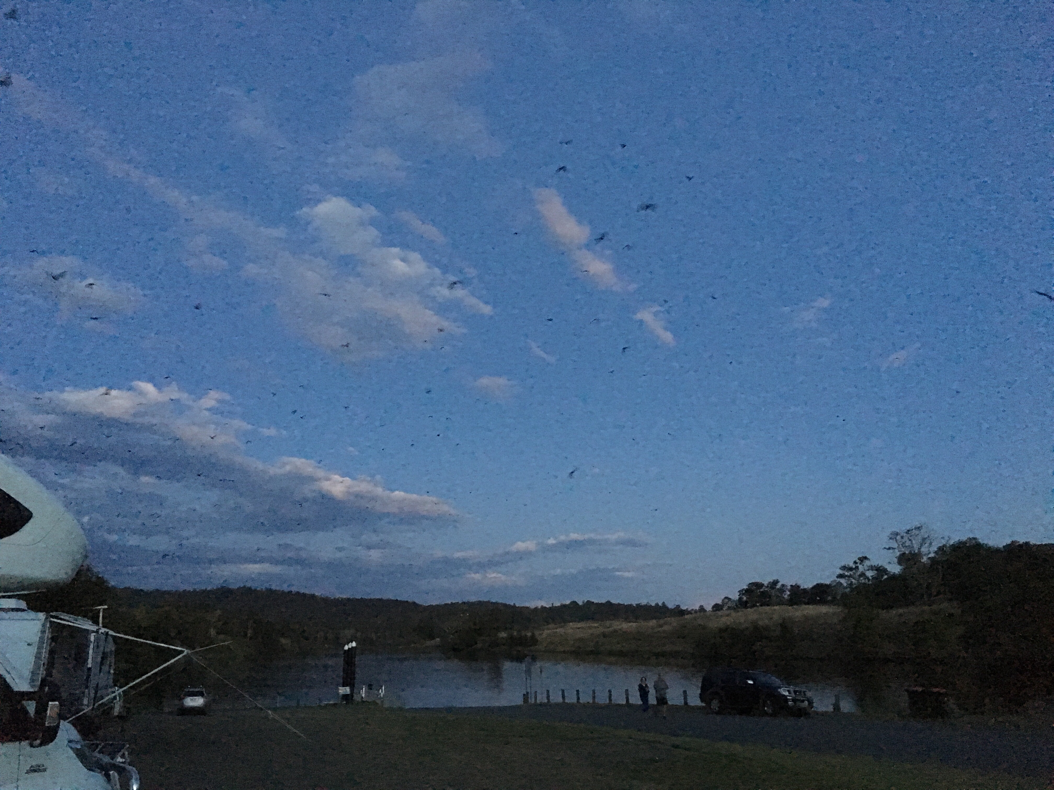 I am camped at Wingham Brush which is a habitat for flying foxes, more commonly known as fruit bats. They look like huge pendulous melons hanging in the trees until dusk, when they stir until there are thousands of them filling the sky as they go off to forage for the night.