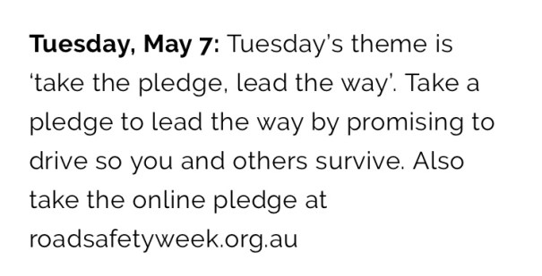 I’m not talking about swearing off the drink here – well, only when we’re driving! This is today’s theme for National Road Safety Week!
