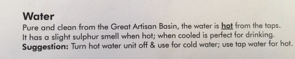 Our here where Artesian water flows there is no need to turn on the hot water tap – water comes out of the cold tap at 36 degrees Celsius or 97 degrees Fahrenheit. As a matter of fact you can turn off your hot water supply and use the storage tank as a cooling tank to supply cold water! Yep, things work in reverse out here 😮