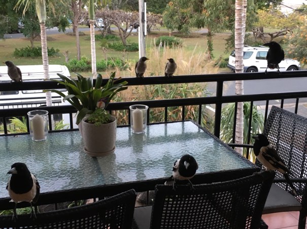 and on the front balcony the magpies, butcher birds and currawongs that come for their daily treat of minced steak.