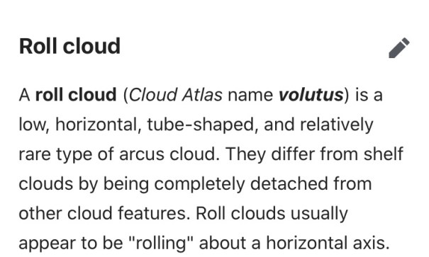 Late yesterday an unusual cloud rolled across the sky, bringing thunder and light rain.