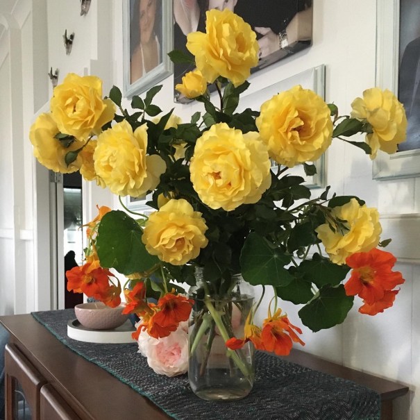 … the yellow rose bush so heavy with blooms that I easily filled this vase and left more than this on the bush.