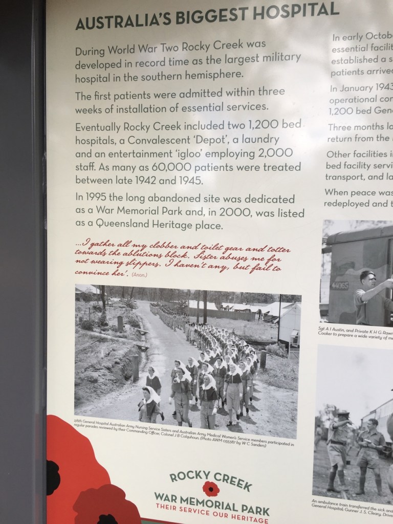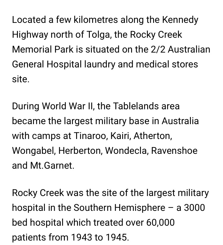 When you look where Tolga is positioned you can see its proximity to New Guinea and its strategic location in the Allied Forces defence efforts. In fact, Tolga and Rocky Creek was home to a 3000 bed hospital as well as the area being used for tropical jungle training.