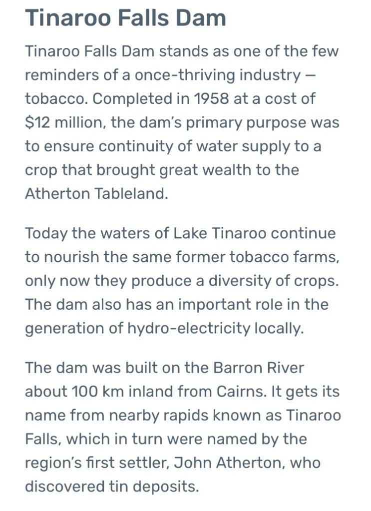 Now for a little bit of history! Lake Tinaroo Dam was originally built to supply water to the thriving tobacco industry in the area. How times change!