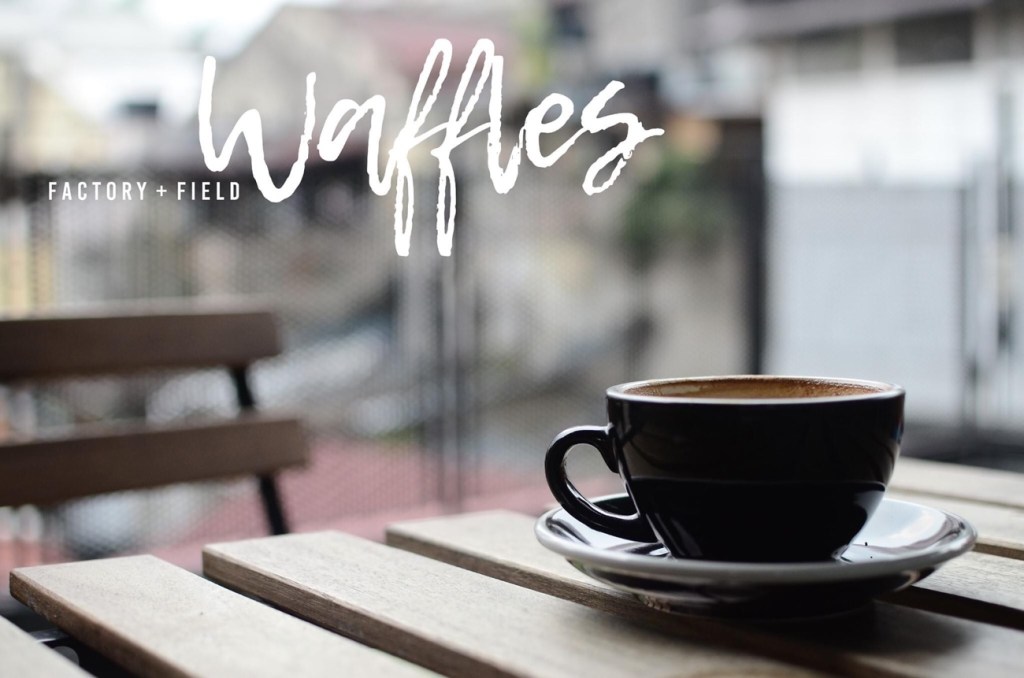 The old brick box of a building where you’ll find Factory + Field Waffles has been restyled in eclectic industrial/warehouse fashion.