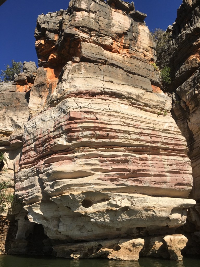 The white areas on the cliff face show the regular flood levels that occur during the wet season when the Fitzroy River rises up to 16 metres and washes the cliffs clean.