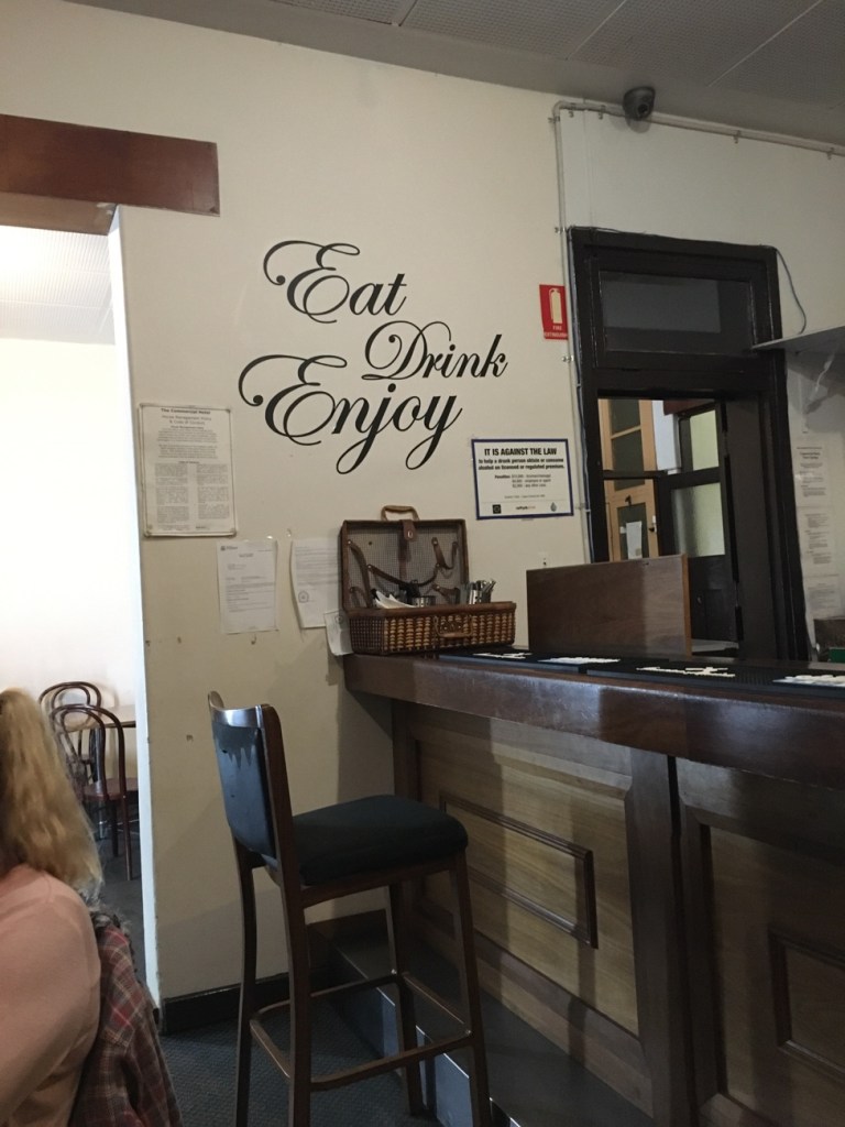 At 10 to 6 we began ordering our meals when we were told that the cook was away catering for the football club dinner at the local hall and wouldn’t be back to start our meals until 7 pm. That’s ok! We’ll sit at the bar, watch the football finals on TV and have a few drinks. A few more people ordered meals and we settled in for the long haul.