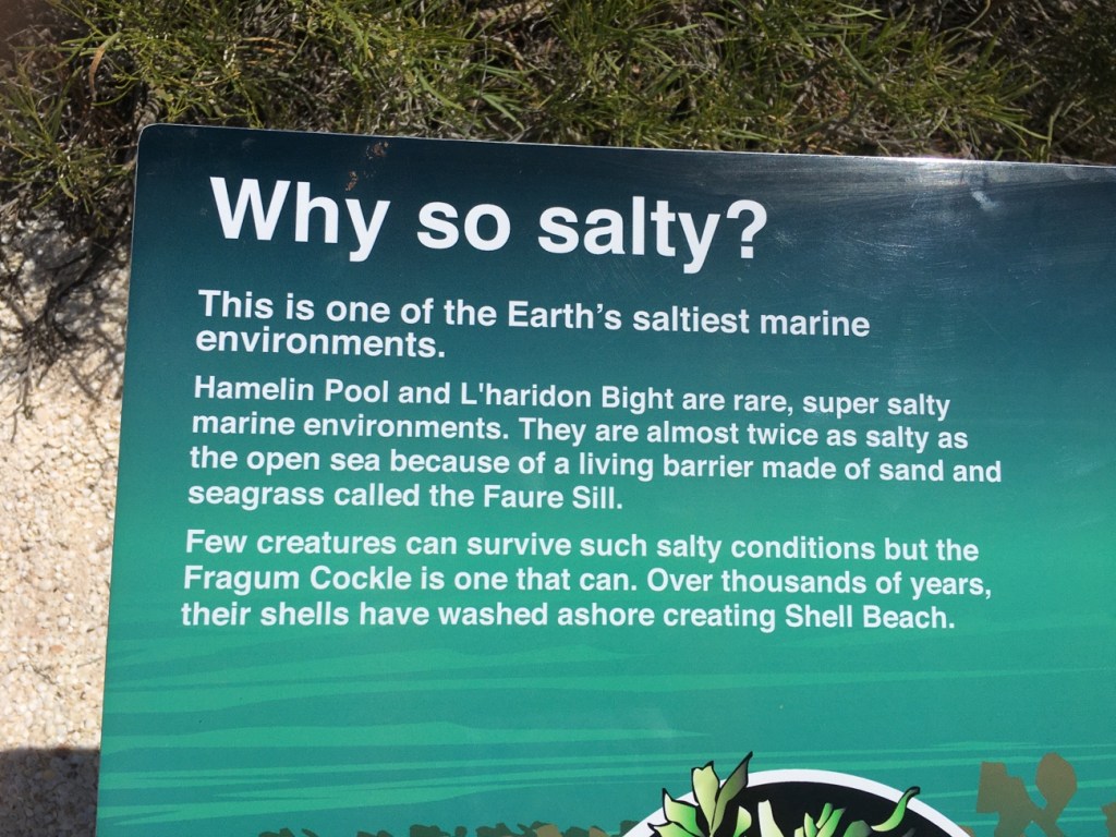 The beach is not only known for its shells but also the extreme salinity of the water due to sea grasses that form a barrier known as the Faure Sill that restricts tidal flow into the southernmost reaches of the bay.