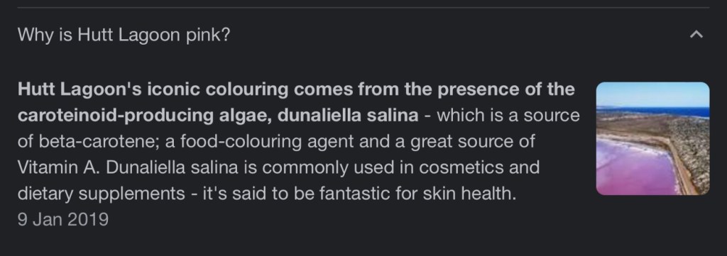 Hutt Lagoon is more commonly known as the pink lake, coloured by algae that produce beta carotene. It is ‘farmed’ for these natural properties.