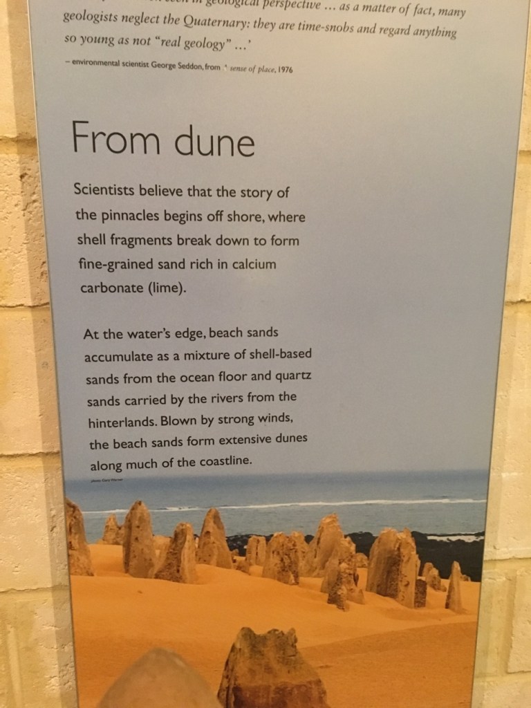 It’s a vast area in the Nambung National Park about 20 kms from Cervantes in Western Australia and scientists still haven’t agreed on how these ‘pinnacles’ were formed. They do acknowledge however that this landscape is constantly changing as the wind blows the shifting sands to either cover or expose these strange rocks.