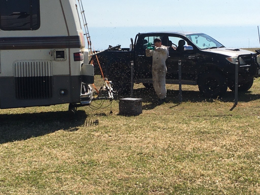 He called a bee keeper to see what to do and the fellow turned up with a hive box, suited up in the full protective gear, and started moving the bees from the RV to a box.