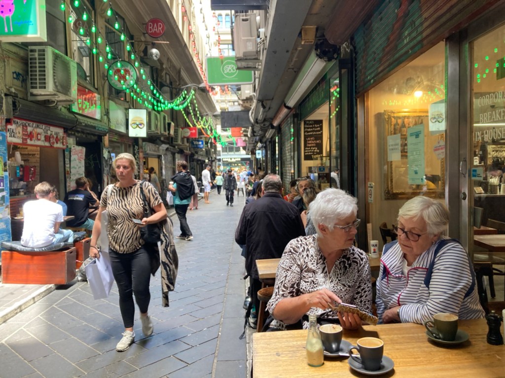 We stopped and had a coffee in one of the busy little laneways in Melbourne. Here’s my friend Kristina & I plotting our next move – two white- haired little old ladies at the table 😂😂😂