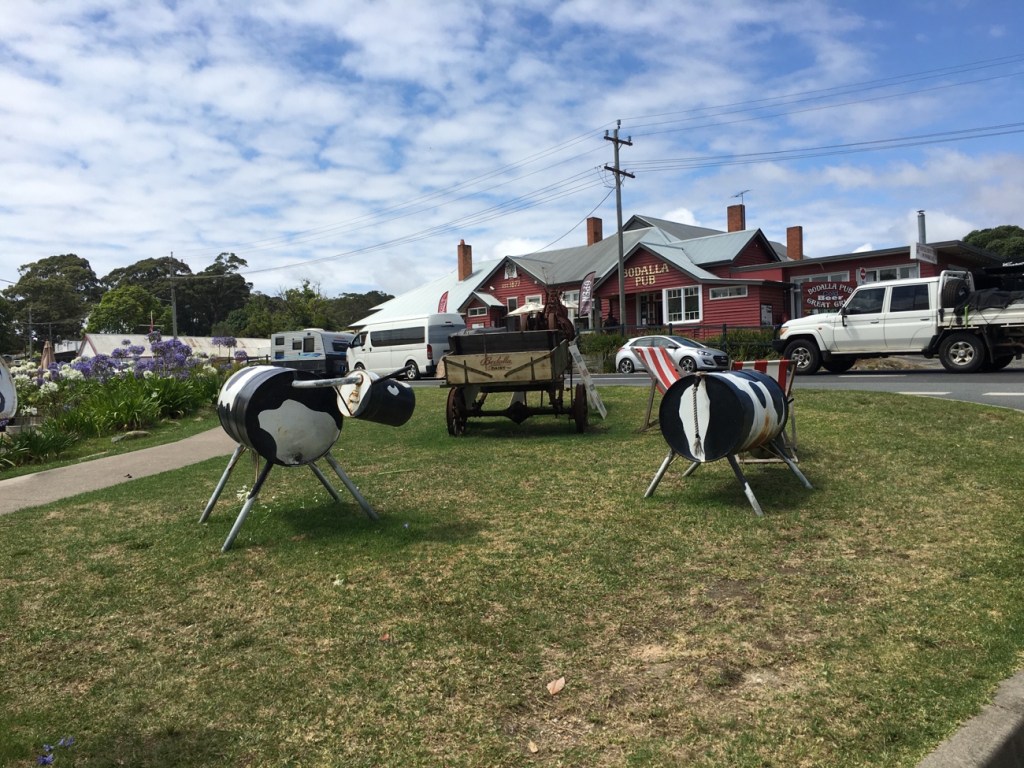 This morning we left to make our way further north but not without visiting the Bodalla Cheese Factory on the way. We missed the bottle feeding of the calves but you couldn’t miss the the clever metal cows dotted around the building.