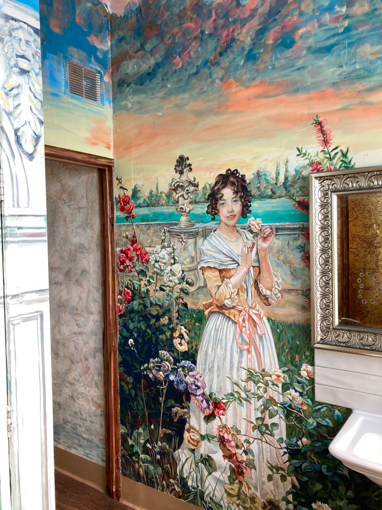 A little further along the hall the ladies room was adorned with murals of gorgeous women in flowing gowns and had the most OTT (over the top) toilet I have ever seen!