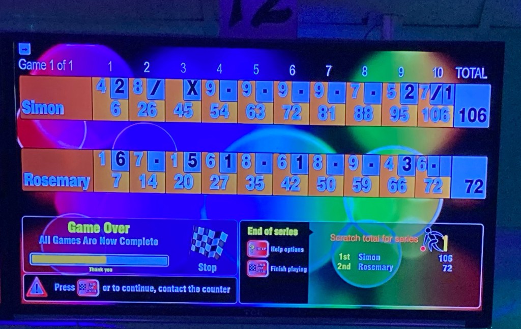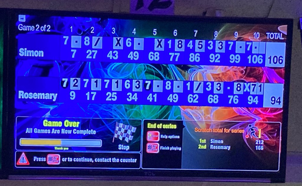 You can see by the score that I didn’t set the world on fire with my amazingly inaccurate bowling technique but I can tell you that my right arm is on fire today after using some rarely used muscles 💪🏼.