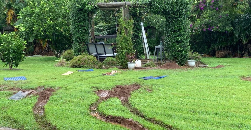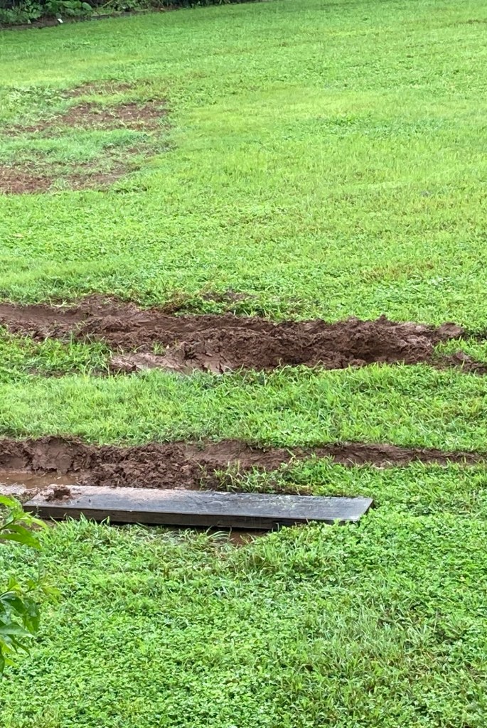 And then there’s The Ugly! The constant rain turned the yard into a bog, and that’s exactly what happened when Dave backed the RV out 😱