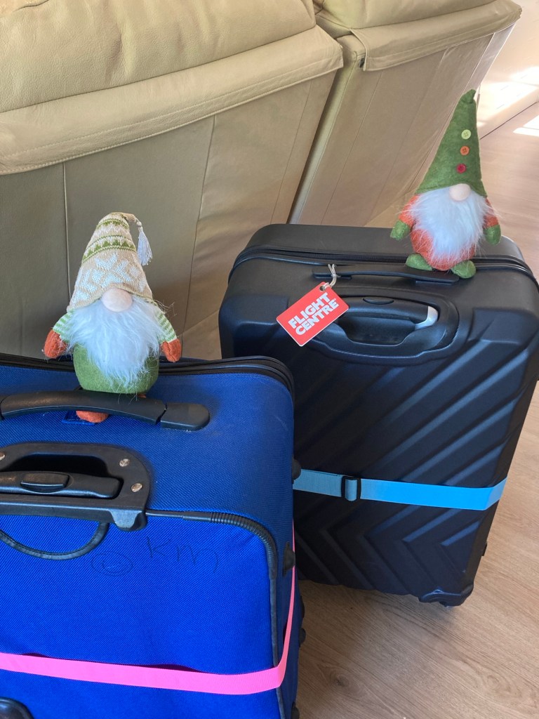 Grimple , the travelling gnome, made sure he wasn’t left behind and with his mate Grundle sat on the suitcases until they were unceremoniously shoved in our cabin bags.