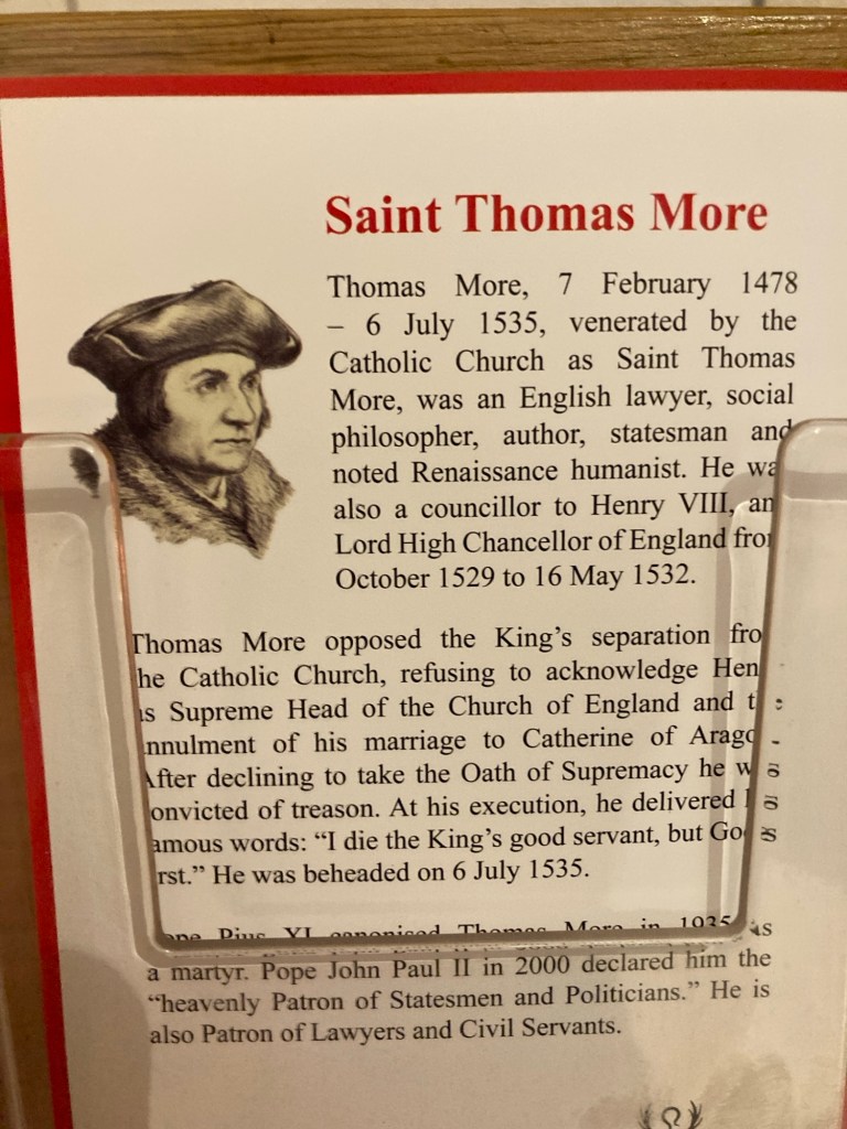 There’s also a small chapel housing the remnants of the hair shirt worn by Saint Thomas More, who was a councillor to Henry VIII and Lord High Chancellor of England 1529 to 1532. He opposed the king’s separation from the Catholic Church and the annulment of his marriage to Catherine of Aragon, was convicted of treason and beheaded for his beliefs in 1535.