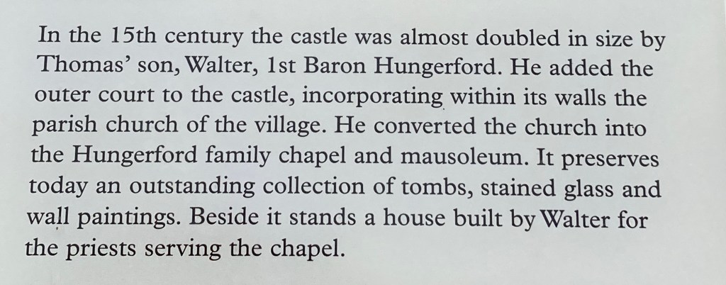 The visit to Farleigh Castle was the ‘icing on the cake’ of a busy, history focused day. I’ve only skimmed the surface of the information about the Hungerfords and the castle. If you’re interested to find out more Click Here