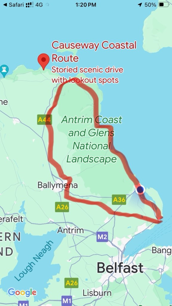 It was a day of spectacular coastal scenery, visiting an iconic destination at the Giant’s Causeway, dodging showers of rain and travelling home through the glens. Here’s the map of our route today, this little story taking us back home to our accommodation at the Lighthouse Loft along the inland road.
