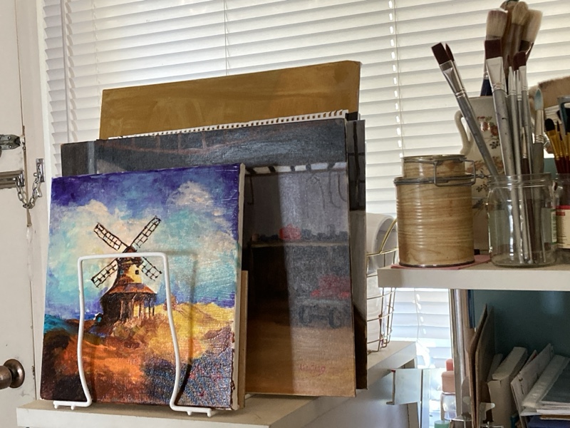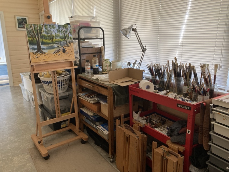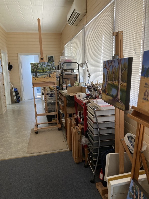 The little cottage where she lives has the perfect studio on the side verandah with plenty of room for all her painting paraphernalia.