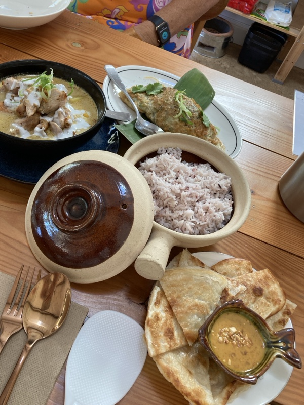 Then it was time for the main course, a chicken yellow curry, aromatic and full of flavour, served with fresh vegetables wrapped in omelette and roti with a satay style sauce.