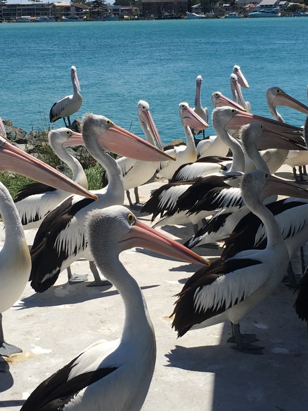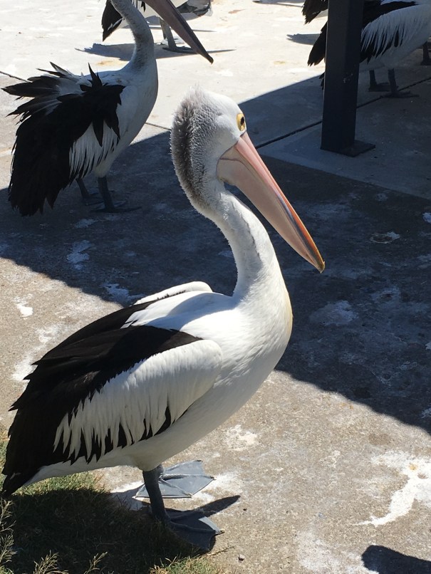 These pelicans were all lined up for the scraps at Tuncurry as fishermen – and women- cleaned their catch.