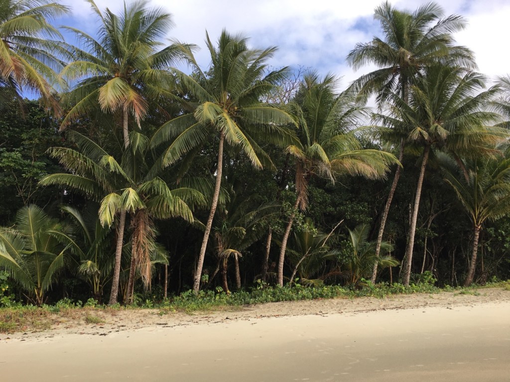 Palm trees line the beach and form the frontline to the rainforest that encloses the Cape Tribulation Campground.